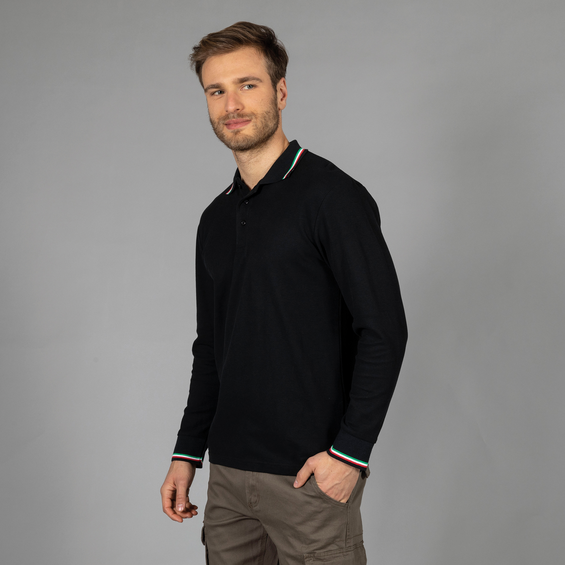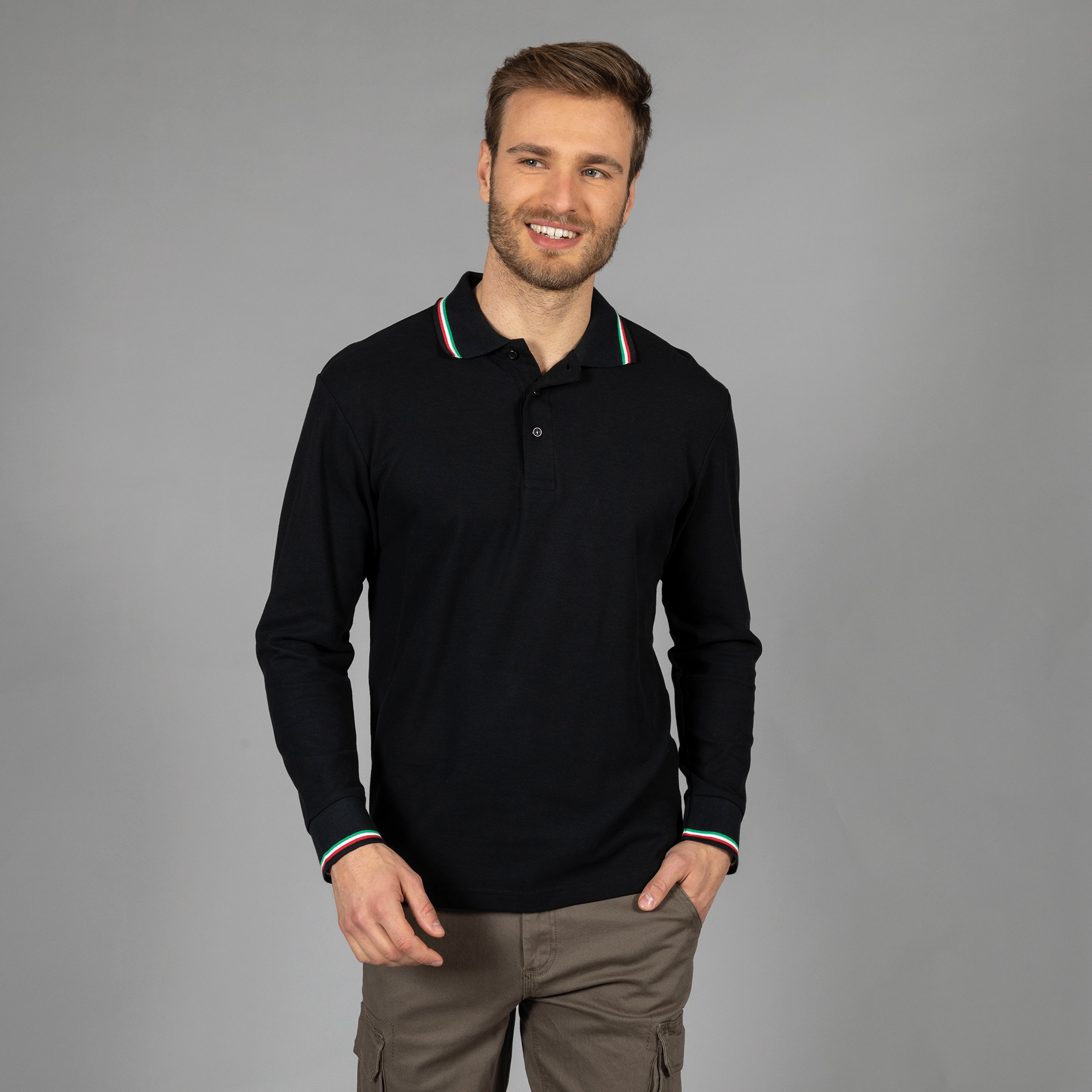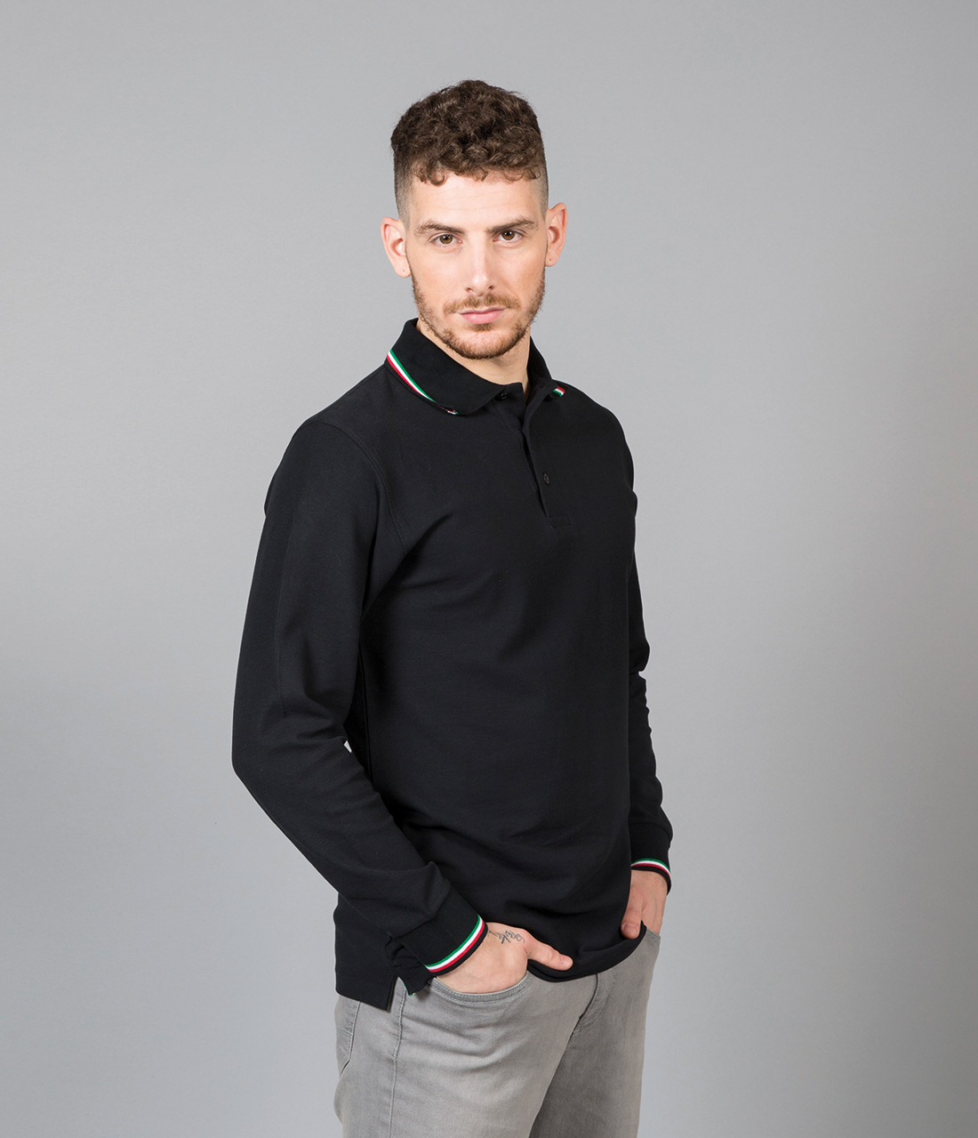 - Piping tricolore su colletto e polsino manica in rib